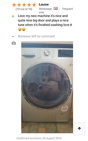 Hon delade recensionen på webbplatsen ’Currys’, som säljer vitvaror. Nu florerar den avslöjande bilden på sociala medier, där folk roar sig på Louises bekostnad.