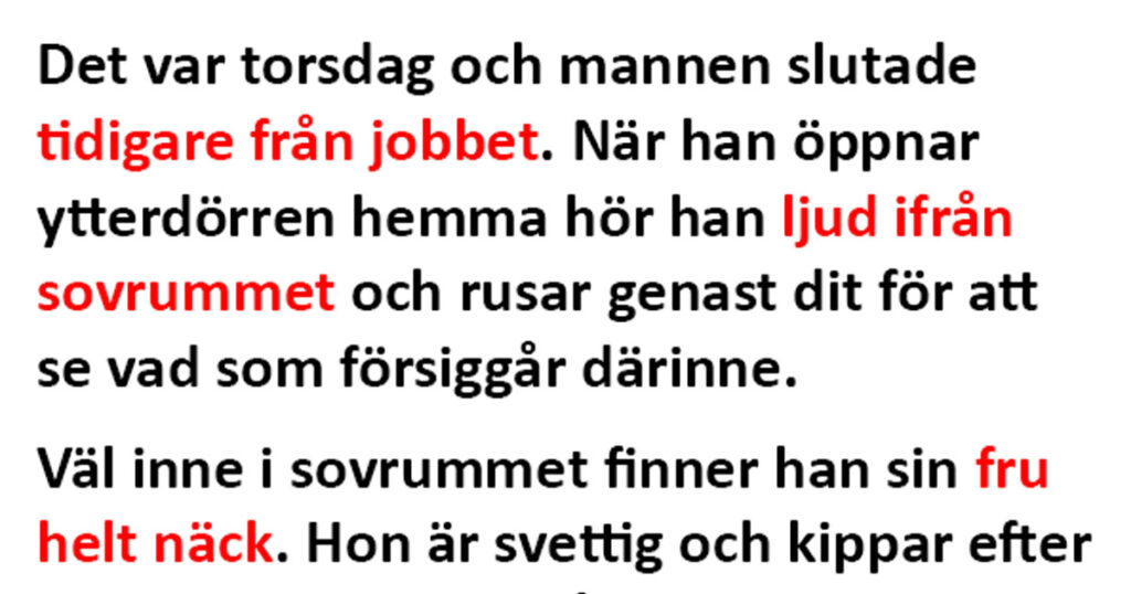 Det var torsdag och mannen slutade tidigare från jobbet varpå han även kommer hem tidigare än han brukar göra på torsdagar. När han öppnar ytterdörren hör han ljud ifrån sovrummet och rusar genast dit för att se vad som försiggår därinne.