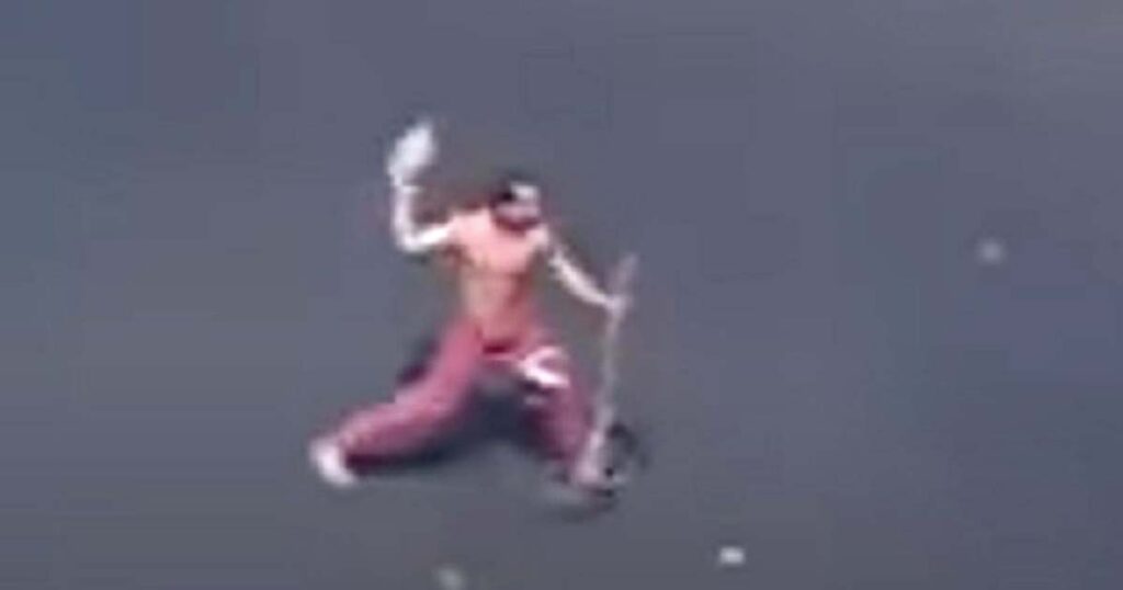 I videon ses den unge mannen upprepade gånger kasta brickor mot mannen, som går iväg med sina hundar från vad som verkar vara en aggressiv folkmassa.