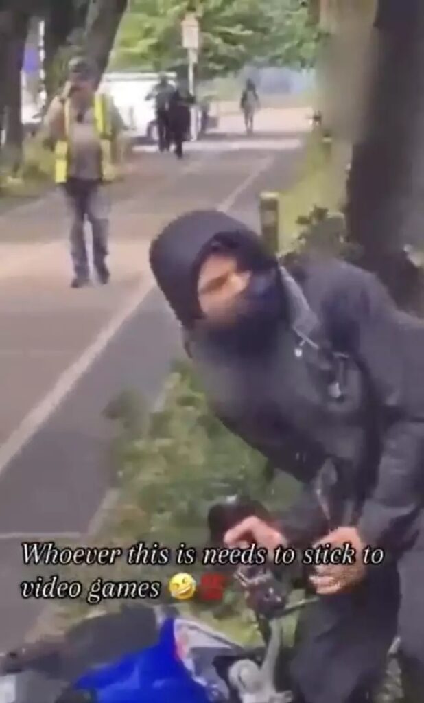 Videofilmer visar paret kämpa med en motorcykel. Cykeln är helt klart mycket större och kraftfullare än den de använde och ser ut att vara värd en fin slant. Tyvärr för tjuvarna var den också betydligt tyngre.