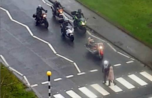 I videon ser vi att den äldre damen står vid övergångsstället vid trafikljusen. Två bilar kör bara rakt över korsningen utan att stanna för henne. Bakom bilarna kommer en grupp på fem motorcyklister. Den första motorcyklisten saktar ner och kliver av sin motorcykel mitt på vägen. De fyra motorcyklisterna som kommer bakom stannar också och bildar en barriär för bilarna bakom.