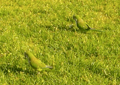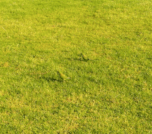 Det är två gröna fåglar som gömmer sig i bilden! Otroligt kamouflerade så de smälter in perfekt i den gröna gräsmattan: