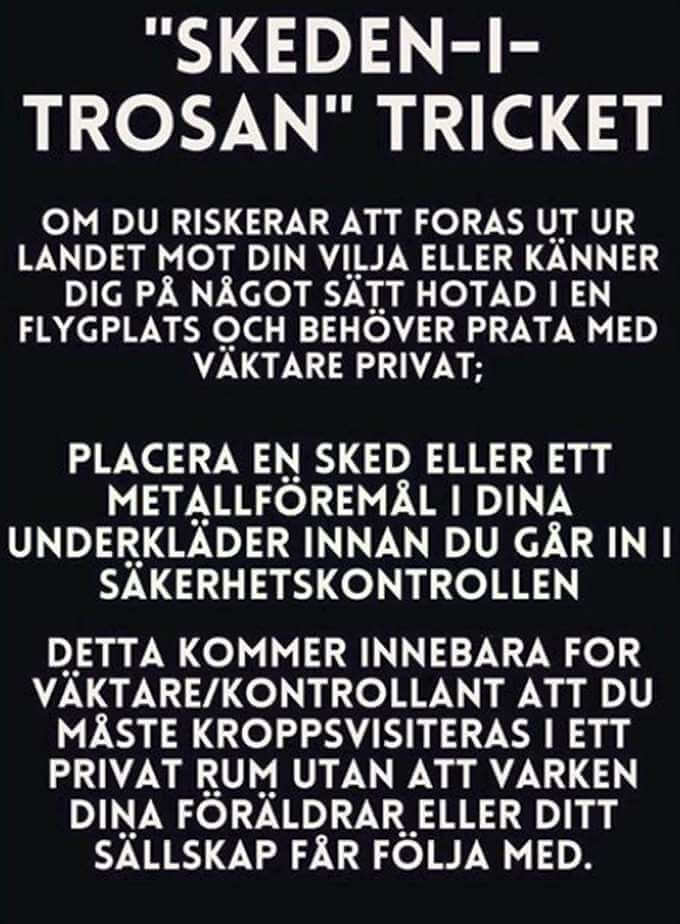 I lördags la de ut ett inlägg som riktar sig till de som kan drabbas av förtrycket och där de uppmanar sina följare att sprida informationen om ”skeden-i-byxan” metoden, vilket är ett sätt att i ett privat rum kunna larma personal på flygplatser.