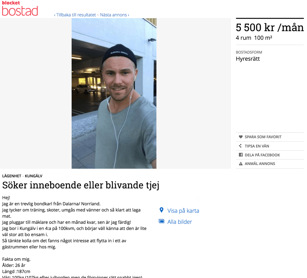 Här nedan kan du läsa Oscars annons själv. Om du inte är intresserad av honom eller att bli hans inneboende kanske du känner en kompis skulle bli en perfekt inneboende hos Oscar.. Tipsa gärna då om annonsen!