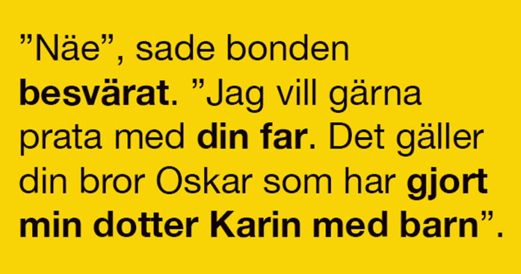 ”Näe”, sade bonden besvärat. ”Jag vill gärna prata med din far. Det gäller din bror Oskar som har gjort min dotter Karin med barn”.