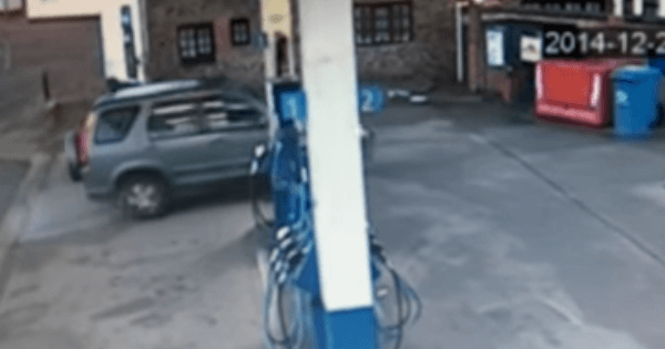 Hon kommer in på bensinstationen, kliver ur bilen och inser att hon har ställt sig på fel sida pumpen.
