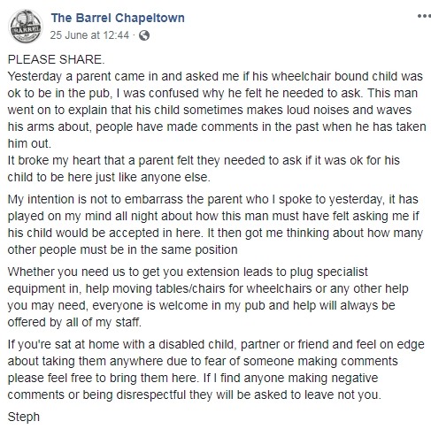 ”Igår kom en förälder in och frågade om hans barn i rullstol fick vara på krogen, jag blev förvirrad varför han kände att han var tvungen att fråga. Mannen fortsatte med att förklara att hans barn ibland låter höga ljud och viftar med armarna, och förklarade att folk tidigare har gjort kommentarer när han har tagit ut honom.