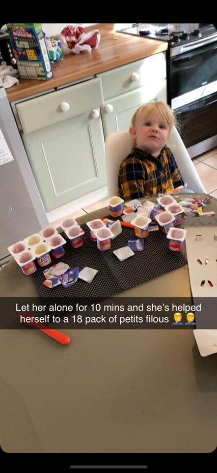 Arron Whysall, 27, kom in från trädgården en lördagseftermiddag för att hitta Olivia leende och skrattande med 18 tomma kartonger yoghurt framför sig!’