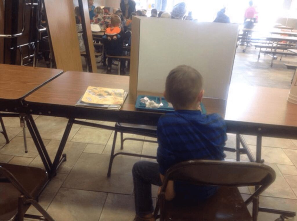 De tvingade honom att sitta ensam på lunchen, med en pappvägg runt sig! Detta borde inte vara möjligt!