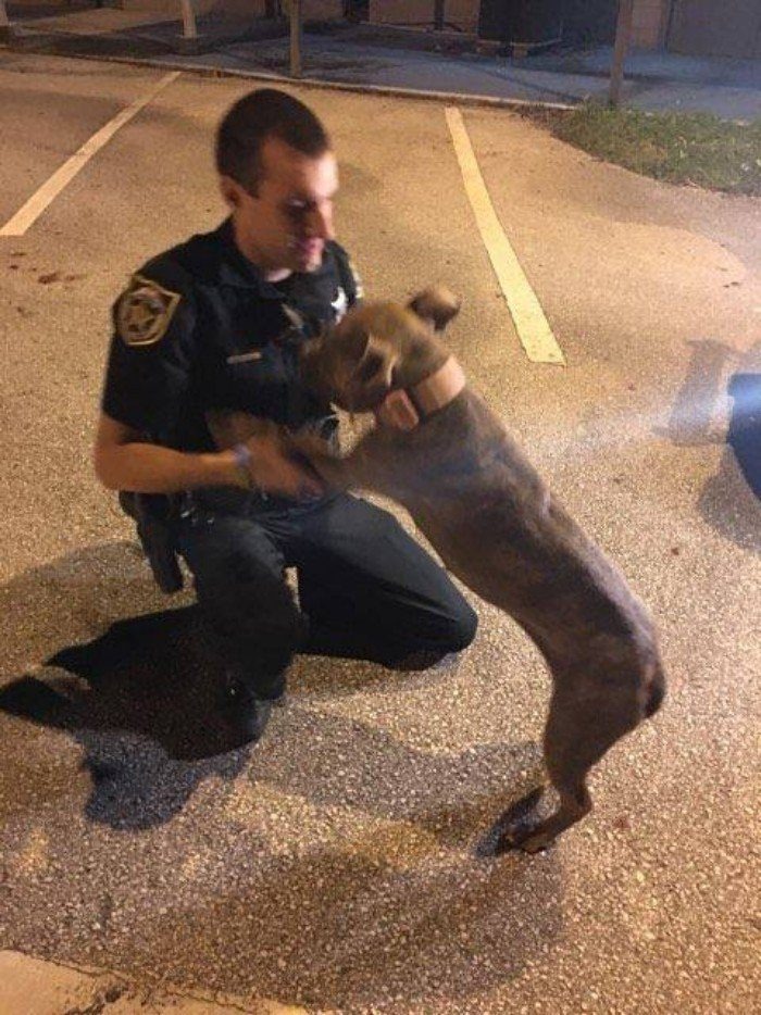 Efter en tur till veterinären och lite vila var pitbullen på fötter igen. Då bestämde sig poliserna för att stanna förbi och hälsa på de två vännerna. Så fort de gick in genom dörrarna kändes de igen av pitbullarna och glädjen att få se dem igen var stor.