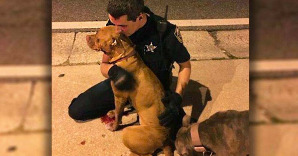 En pitbull verkade vara skadad. Patrick drog sig åt sidan och ringde 911. Två poliser dök snabbt upp för att hjälpa till.