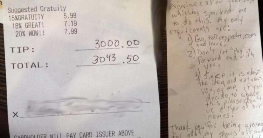 En servitör från en icke namngiven restaurang hade skickat en bild till honom. Det var ett fotografi av ett kvitto och en lapp som en kund lämnat till henne efter en middag.