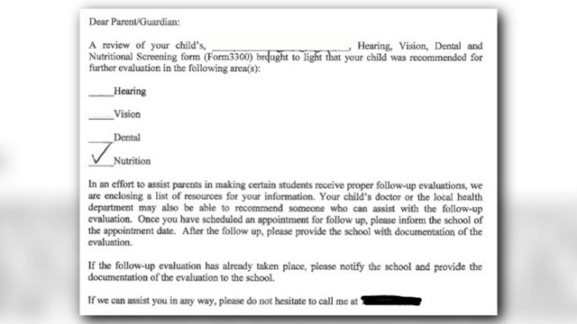 I brevet står det att deras dotter behöver ytterligare undersökningar av läkare då hennes BMI är för högt i förhållande till vad som rekommenderas för hennes ålder.