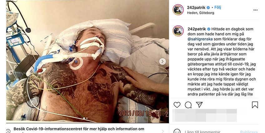 – Jag såg och hörde hur hemskt sjukdomstillståndet är för covid då det är jävligt svårt att få luft och det är som att drunkna… Jag hade själv liknande symptom och väldigt dåligt med syre i blodet och fick sövas ner så maskinerna fick sköta det, jag förstår nu hur nära det var att jag inte klarade mig och jag hyllar alla som hade hand om mig under hela vistelsen på Sahlgrenska, djävulen i mig tycker att alla jävla förnekare och antivaccin idioter borde få känna på att drunkna i sig själv utan att få nån hjälp av samhället, men så får man väl inte tänka eller?, skriver Patrik Sjöberg på Instagram.