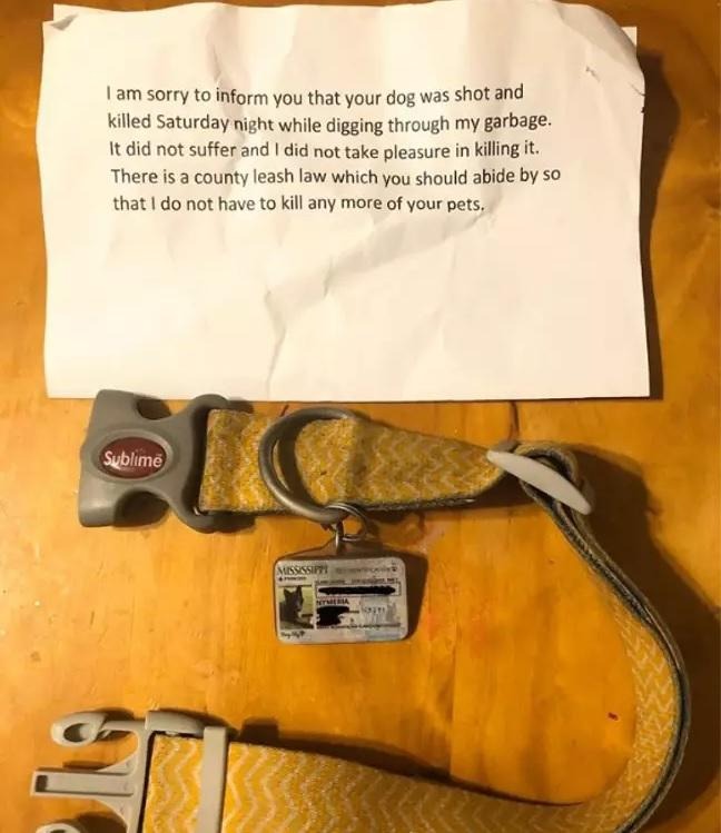 ”Jag är ledsen att meddela att din hund sköts och dödades på söndagskvällen när han grävde i mitt sopor. Den led inte, och jag njöt inte av att döda den”, står det i brevet, som fortsätter: