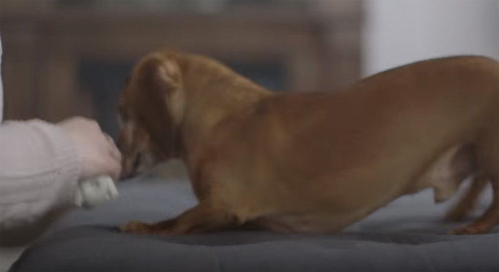 Här finner du hela klippet när taxen Finn återförenas med sin favoritleksak