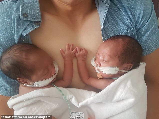 Tvillingarna föddes i samma fosterhinna i livmodern och delade på moderkakan, men de hade varsin navelsträng. Ett sådant tillstånd har stor riks för komplikationer.