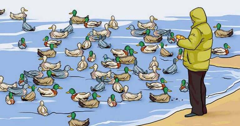 Vi ser någon som matar ankor vid vattnet, men det är något som sticker ut i vattnet, kan du hitta felet?